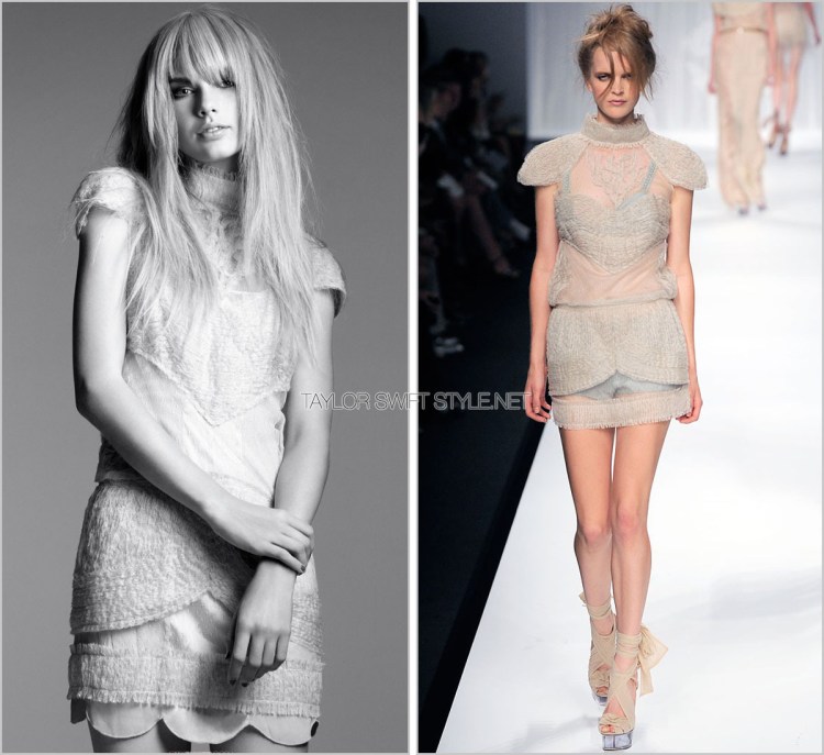 This strapless mini dress – featuring a chantilly lace overlay and tulip skirt – didn’t appear in the runway of Jason Wu’s Spring 2010 collection but it did make it into Taylor’s Spring 2010-infused spread with Elle back in April 2010.