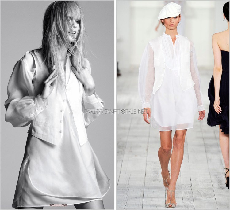 In a sexy, tousled, just-rolled-out-of-bed look Taylor wore this silky sheer shirt dress by Ralph Lauren.
