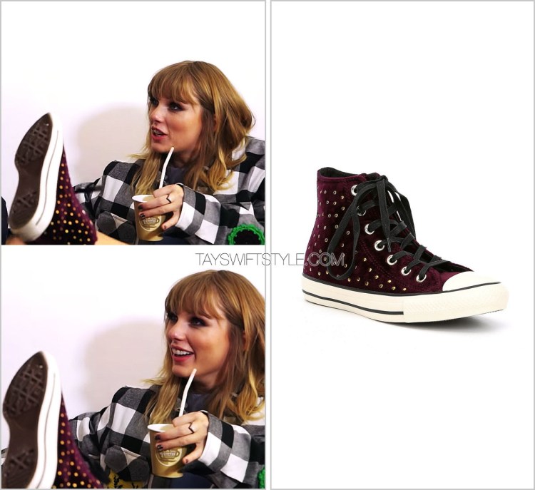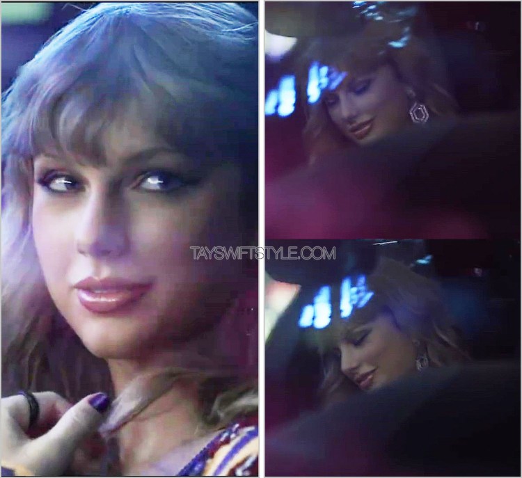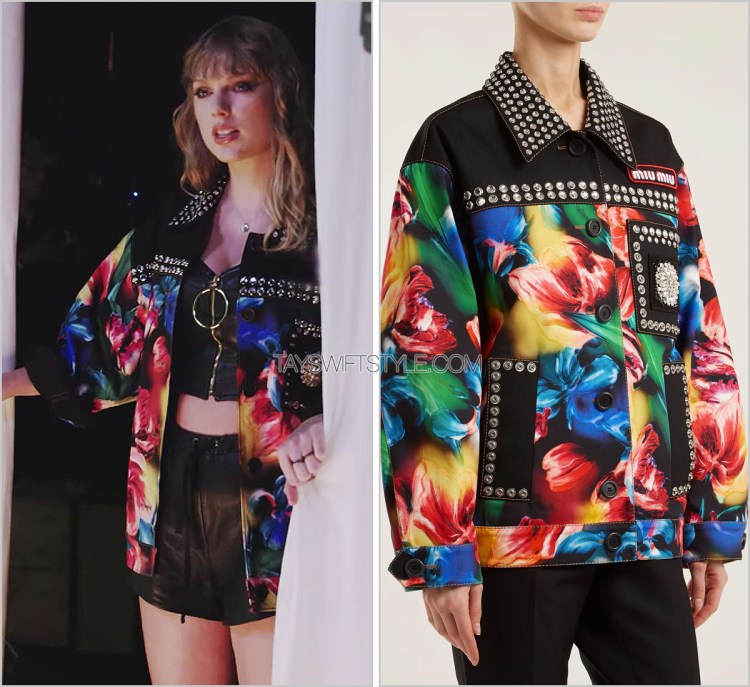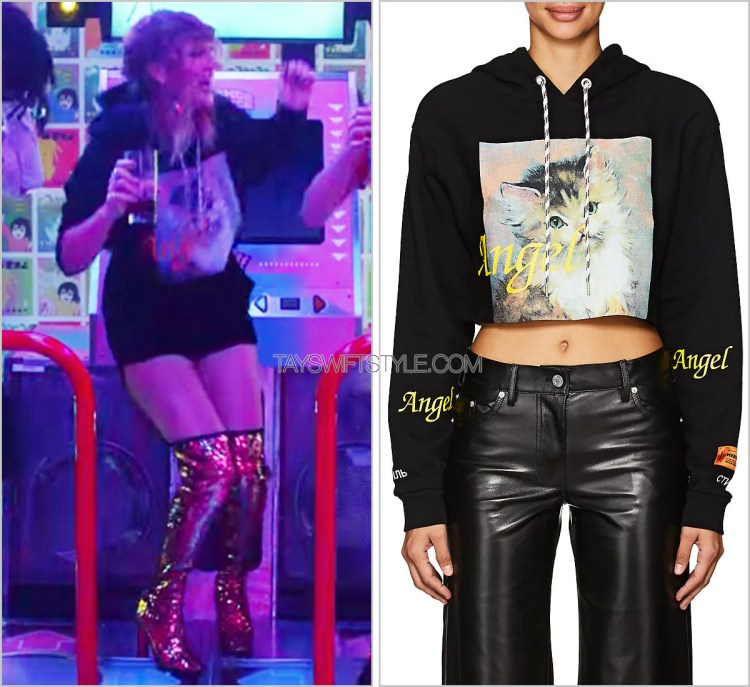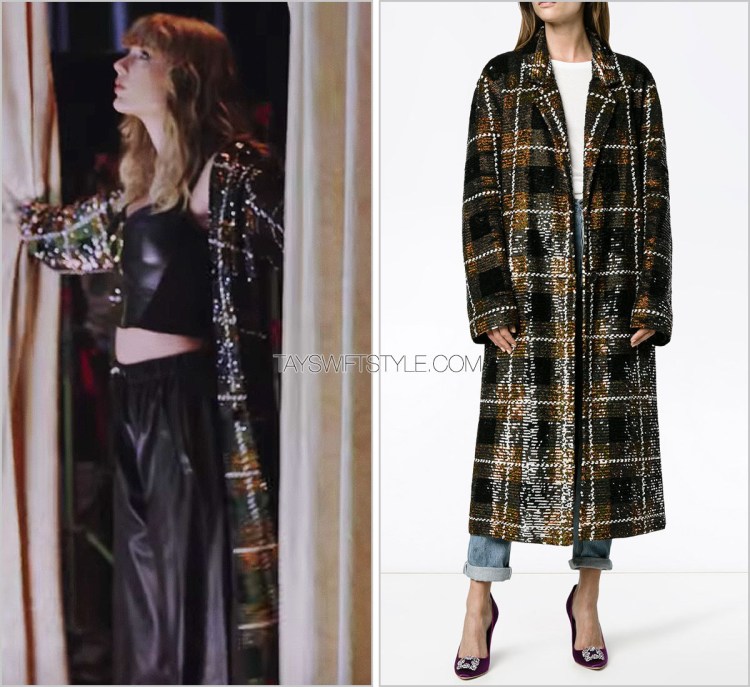 Taylor topped off her all-leather outfit with more sequinned outerwear by Ashish. This would be her second Ashish piece in this music video alone in addition to this rainbow dress.