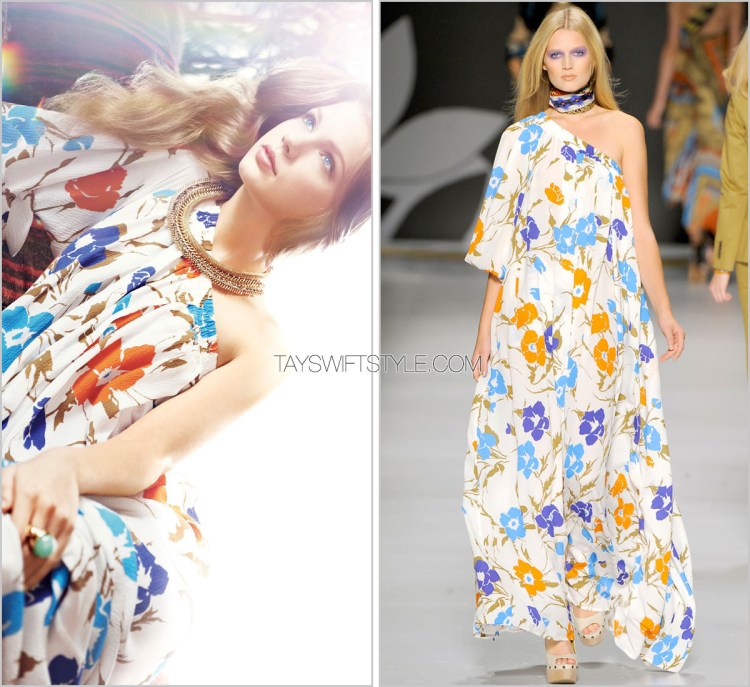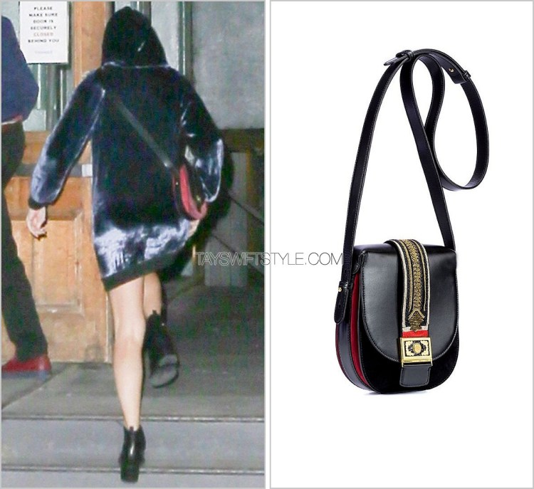 Taylor carried a brand new black crossbody from Etro’s Fall 2016 collection. Her version appears to lack the jacquard details over the top of the bag, but still features its red siding and square buckle.