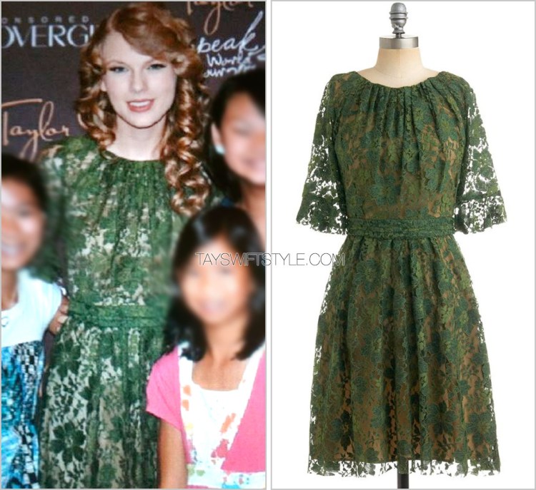 To promote her then-newly released album RED, Taylor hosted a mass radio interview event. She wore a ladylike cardigan over a prim and proper Eva Franco dress.