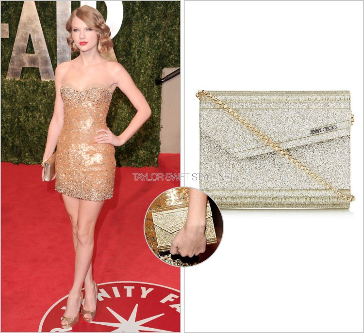 Taylor finished her accessories with another glittery piece by Jimmy Choo — their perfectly-sized ‘Candy’ clutch.