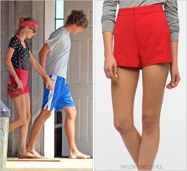 After seeing this photo Taylor took with a fan from that day and noting the buttonless front on Taylor’s red shorts, I knew it was this pair from Urban Outfitters. Especially since they appear to fit around Taylor’s thighs a bit looser than her usual high-waisted, fitted shorts tend to.