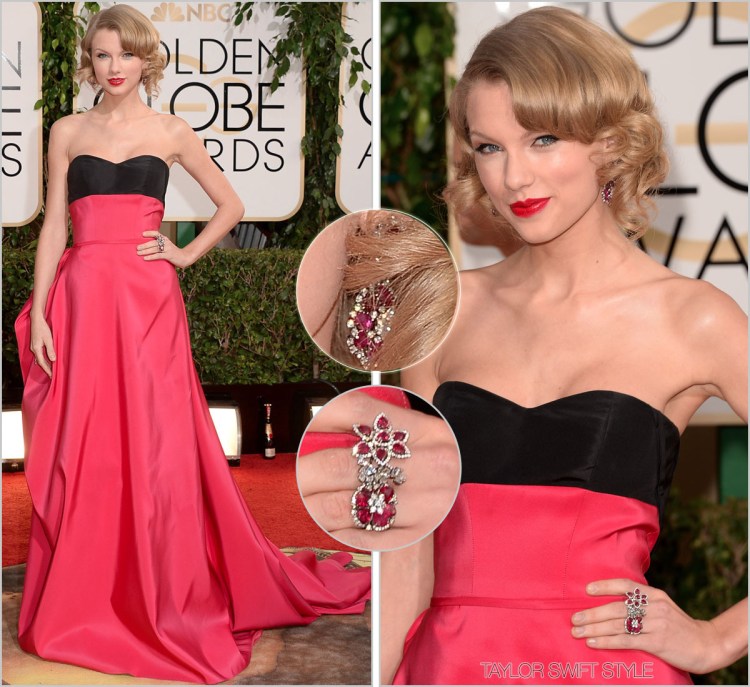 After some fun early predictions to last minute (and correct!) predictions, Taylor stepped out on the red carpet at this year’s Golden Globes looking absolutely stunning in this bi-coloured Carolina Herrera gown from the Pre-Fall 2014 collection. The red gown with a dramatic bustle also featured a contrast black bodice for added interest.