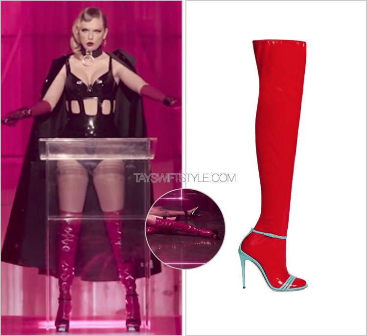 Taylor appears to be wearing a lot of Gucci in this video! It looks like she opted to just wear the latex thigh-high sock here and ditch the powder blue strappy sandals for a more substantial pair of black platform open toe heels.