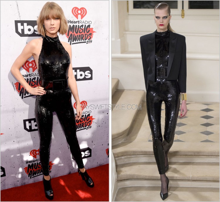 Before landing on the Yves Saint Laurent dress I ultimately went with for my TSS Predictions post I came about this || close to choosing this sparkly jumpsuit instead. At the time, I thought it would be way too far out of left field for Taylor. At this point, I should have known to never count Tay out of anything.