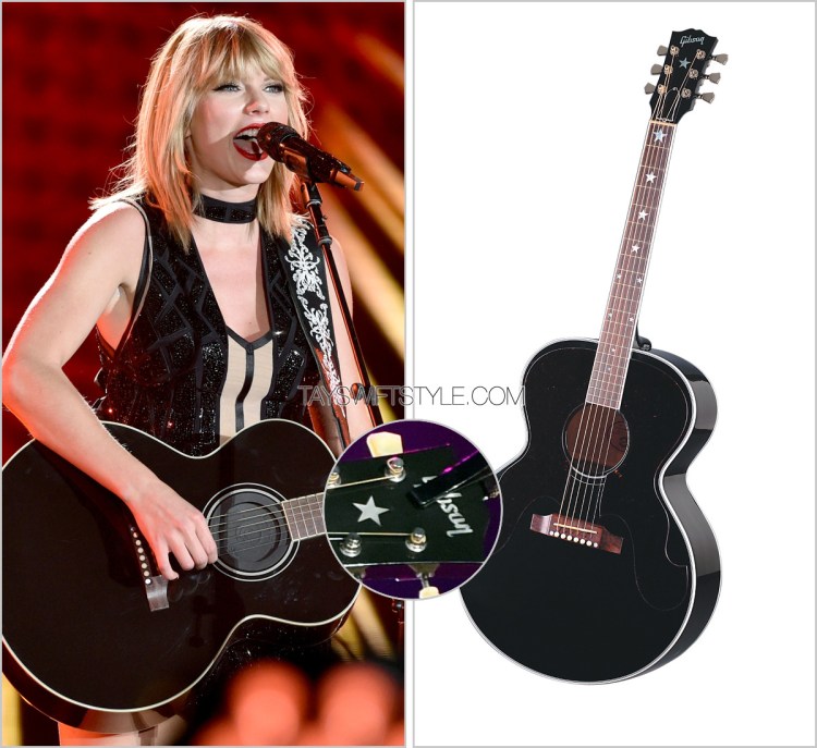 In addition to playing “Fearless” with this guitar in her spangled Jenny Packham dress, Taylor mostly used it during her acoustic set.