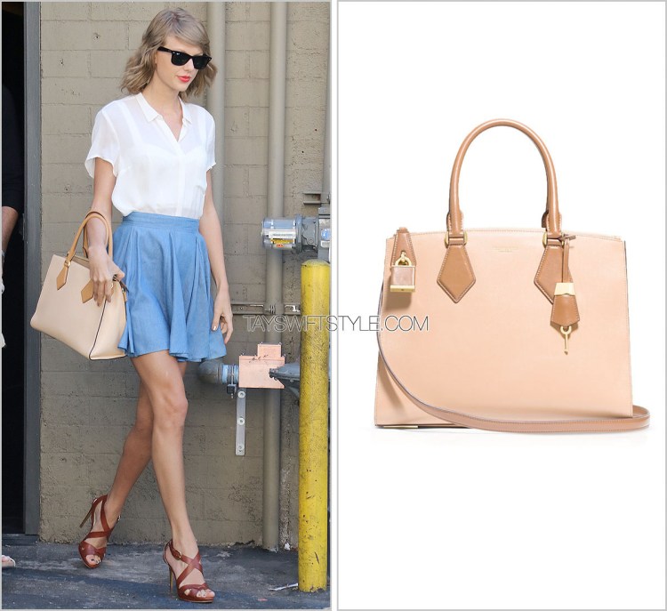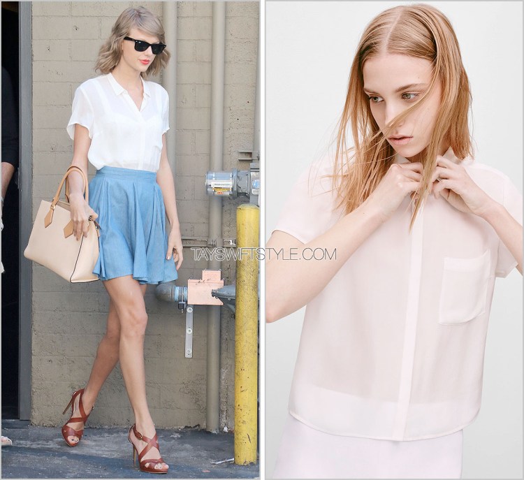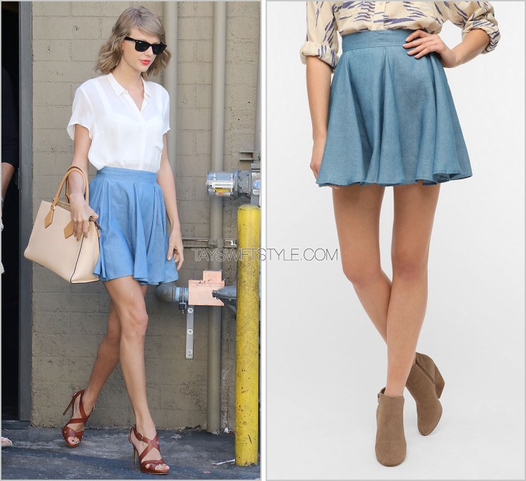 I think this would have to be my favourite interpretation of Taylor wearing this skirt thus far. Tapping into one of her Five Major Aesthetics — ‘The Schoolgirl’, Taylor took a girly summer staple like a chambray skirt she’s worn previously and added other easy summer aditions like a sheer white collared top, nude bag and killer brown strappy heels for that 1989 sexy kick. Speak Now-era Taylor probably would have opted for heeled brown oxfords.