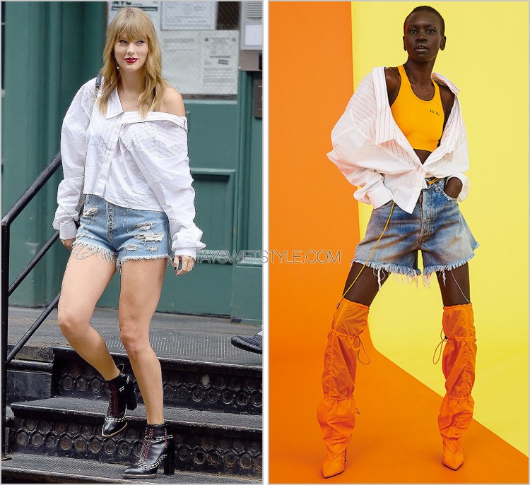 Silver eyelets punctuate the front of these distressed denim shorts — a staple that Taylor has been rotating in varying washes and frays in her candid style as of late.