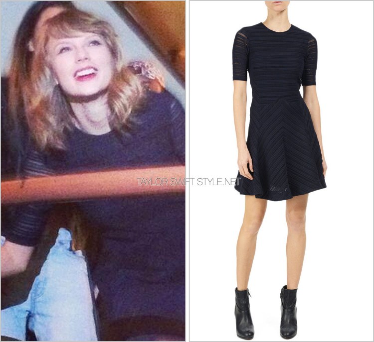 Taylor supported musical bestie Ed Sheeran by attending his NYC show at the Hammerstein Ballroom. She wore this textured, sheer-sleeve Rag & Bone LBD while rocking out to “Sing”.