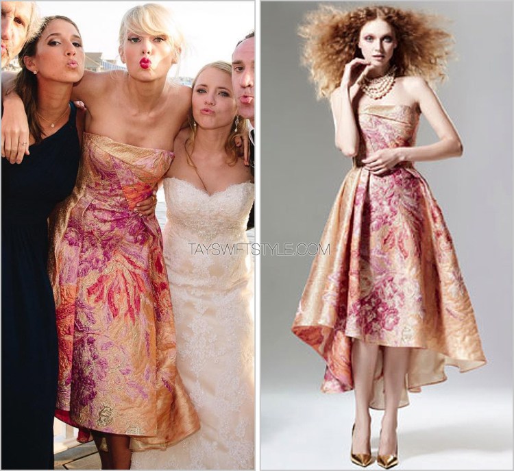 What do you think of Taylor’s beautiful floral brocade strapless dress?