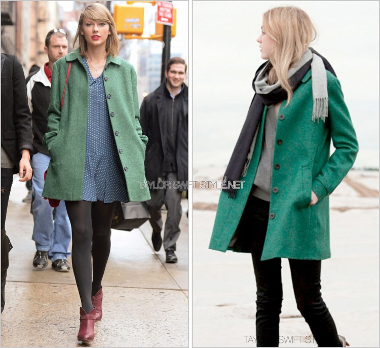 I love this bright colour green against the pretty spring blue dress – a brightly coloured coat is a great way to add interest to any outfit. Taylor’s original coat is from Katherine Hooker’s Winter 2012 collection and is available to custom-order from the brand for £960.