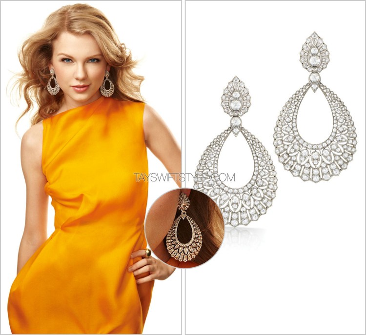 Taylor’s stunning 18k white gold and diamond earrings from the cover were cut into a beautiful vintage-inspired fan shape.