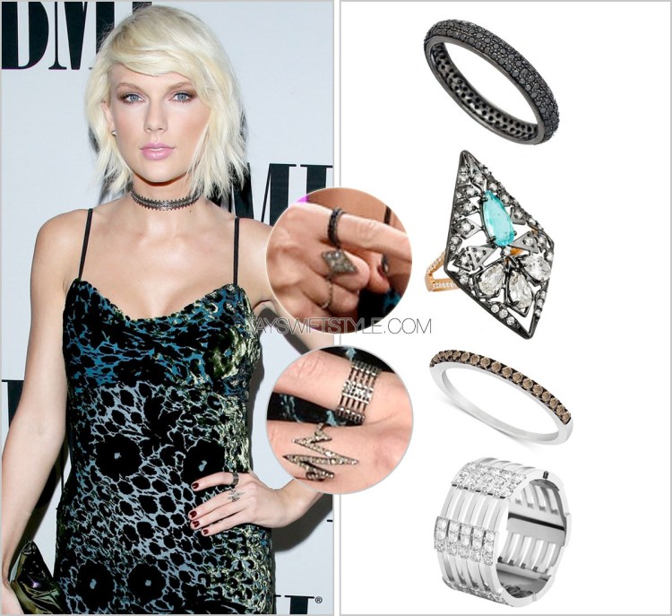 That Moritz Glik ring (and name) should ring bells for some of you. Taylor has repeatedly worn this brand’s “kaleidoscope” series rings for the last few weeks.