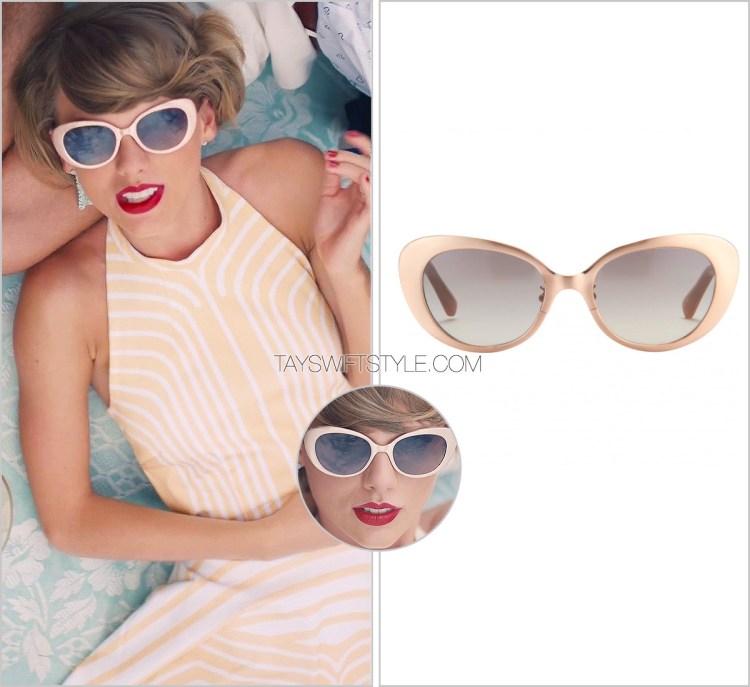 I believe Taylor is wearing a matte pair of these cat-eye sunglasses by Linda Farrow. Looking very retro.