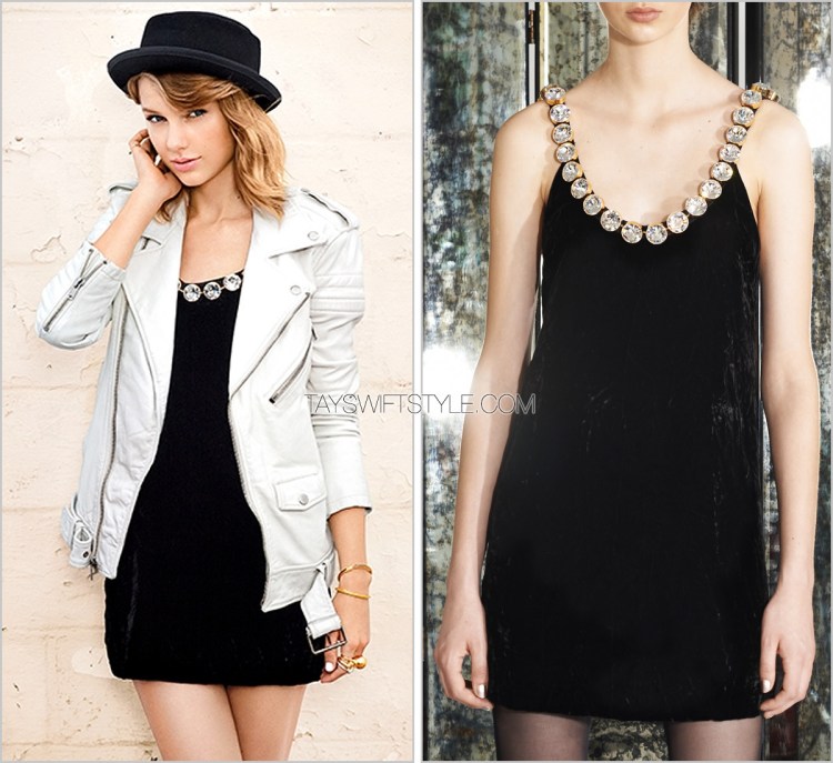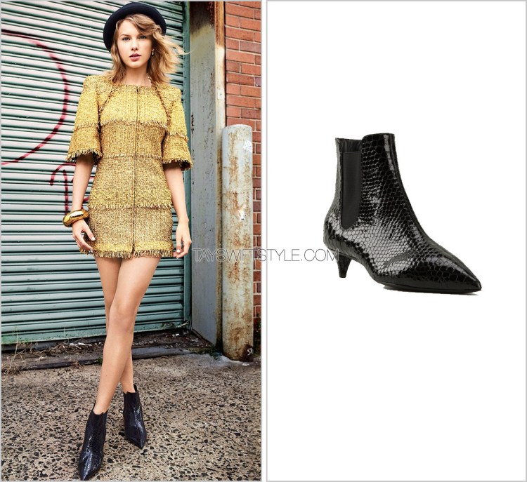 To contrast with her structured gold tweed outfit, black accessories to up the cool girl factor were put on Taylor. Including these pointed-toe ankle boots by Giuseppe.