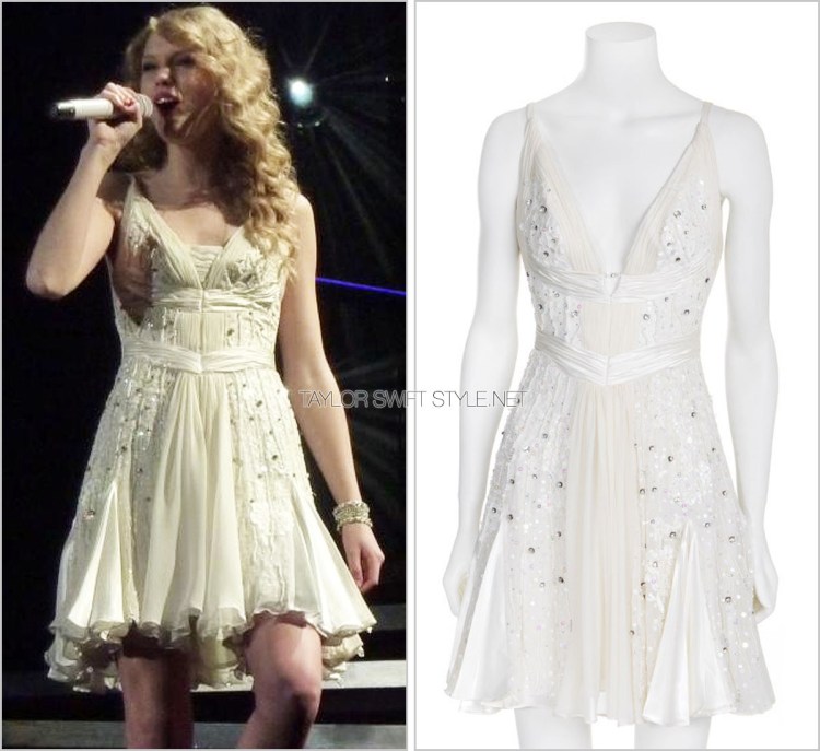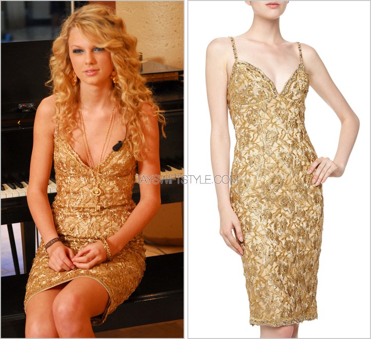 To celebrate the gold certification of her eponymous debut album, Taylor appropriately wore a gold beaded dress by Mandalay – a brand she frequently turned to back in the day for sparkly performance dresses.