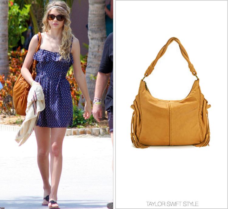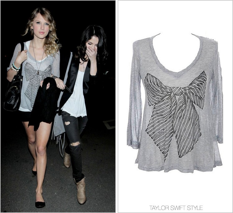 Taylor’s “Love” rosette really livens up this plain tee and frayed jeans duo. It was by TopShop (photo unavailable).