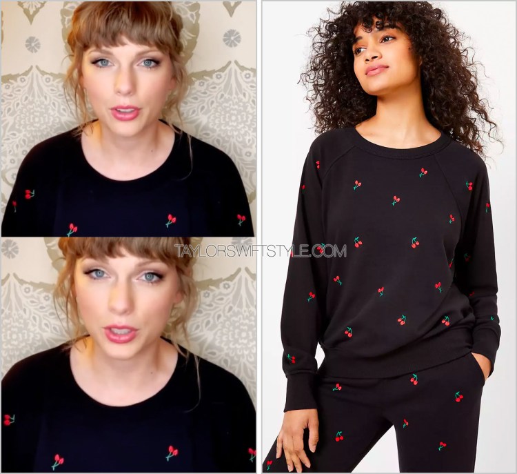Her cherry-printed sweater is by the very soft loungewear brand Lou & Grey.