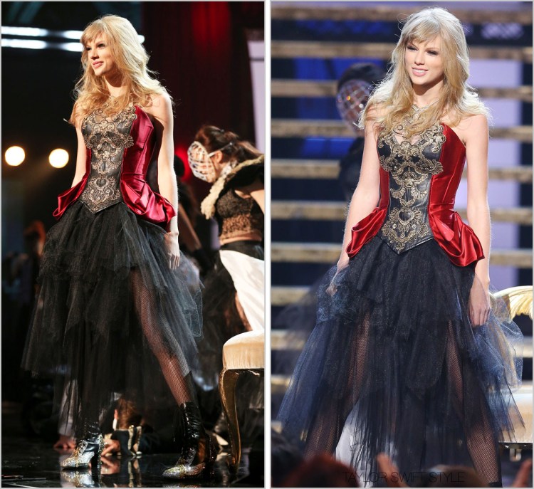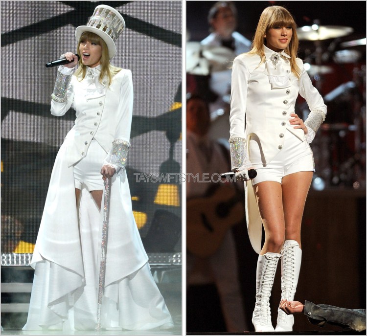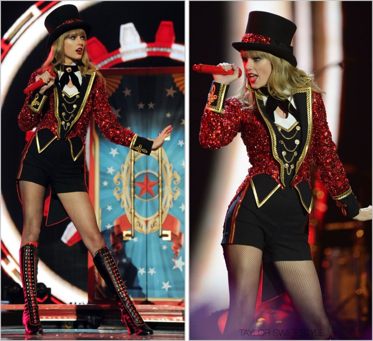 Much like the later iterations of this circus-themed performance both at the MTV EMAs and on the RED Tour, Taylor turned to costume designer Marina Toybina for her all-white ensemble and Laduca for her lace-up knee-high boots.