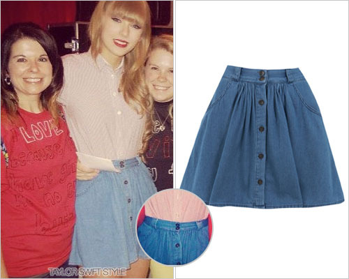 Taylor looks sweet and casual in this U.K. brand’s button chambray skirt. This is Tay’s second that she’s worn during Club RED. The first being this one by American brand UO.
