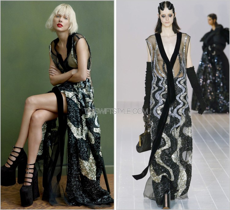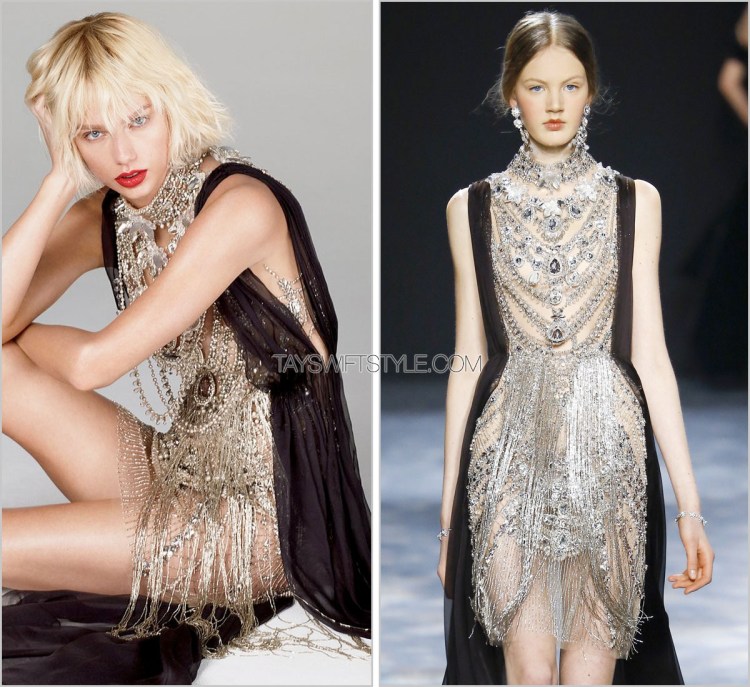 Let’s just have a moment of praise for Tonne Goodman – the fashion editor on set for this spread – who had the good sense to restyle this silver spaceman dress for Taylor’s shoot and forego the bulky necklace and extremely out of place brown cowgirl-esque boots.