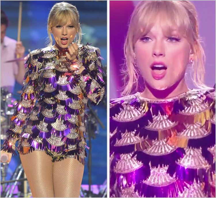 I also like the cute details around the shoulders of cutouts. That said, it follows the same essential silhouette we’ve seen from Taylor’s last few “ME!” performances: A silhouette that takes the tightness of a bodysuit and marries it with the leg length of a romper. At this point of repetition, it feels like a go-to performance uniform we may see on tour.