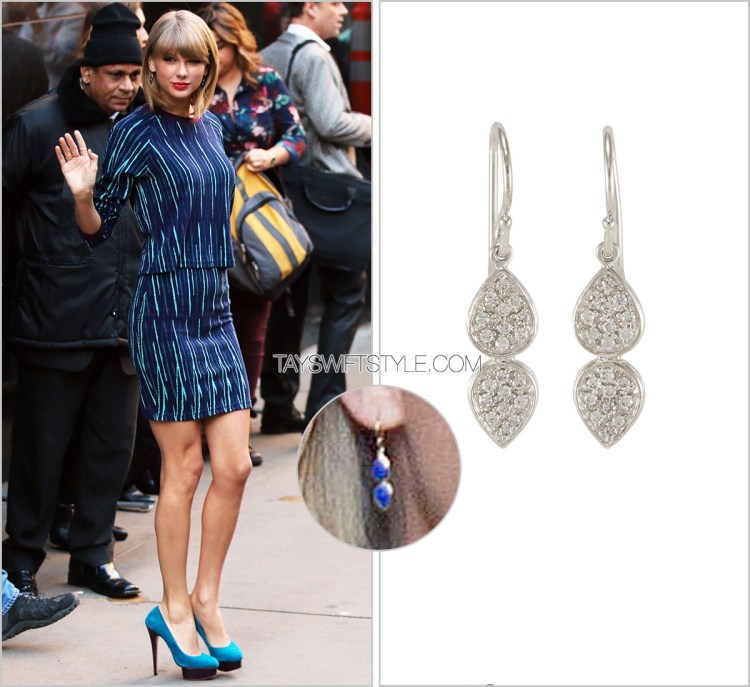 Taylor wears a blue stone version of these Melinda Maria earrings.