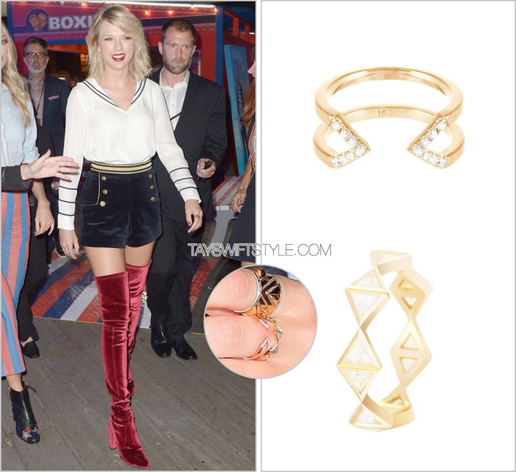 Though hidden underneath her coat, Taylor was wearing a few new white gold rings for her after-party appearance. A nice complement to the star motif on her romper.