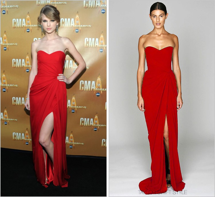 This particular shade of red is ravishing on Taylor (Would I personally wear this to a v glam holiday party? Yes). I know not all feels the same way, but something about a strapless gown and a bare neckline really gets me and feels bare but in a vulnerable and lovely way (Maybe it’s the exposure of collar bones? Unsure). The drape and leg slit are fun, beautiful, and timeless.