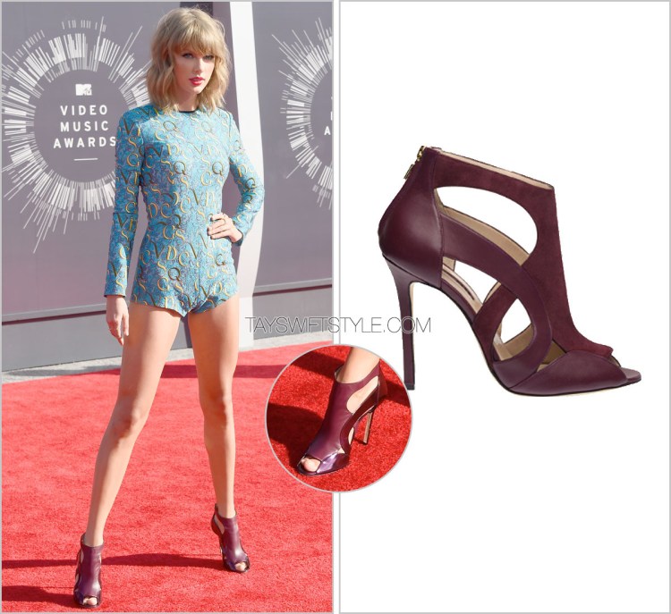 Taylor’s wine-coloured peep-toe cutout booties are by Elie Saab. While I think the cutouts on these heels are killer, I would have preferred to have seen either of the options she debated with music executive Charlie Walk pre-show.