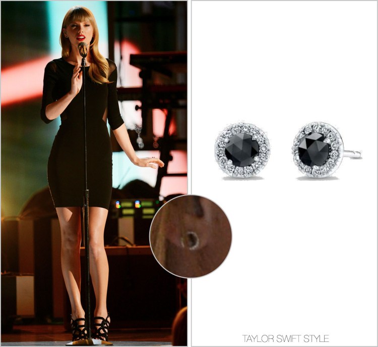 Taylor wore these drop earrings by Normal Silverman – keeping her neckline thankfully bare so as not to interfere with the bejeweled neckline of her D&G gown.