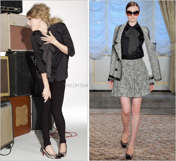 Heavily inspired by the 60s rock’n’roll scene Glamour senior fashion editor Maggie Mann cited Bob Dylan as a major influence for the styling on this shoot. I would have to say with the sheeny fabric of this sheer-sleeve and embellished-cuff Valentino dress that they hit the nail pretty much on the head. With that teased bouffant of hair and heavily lined eyes Taylor looks like she could be leaving a concert from back in the day.