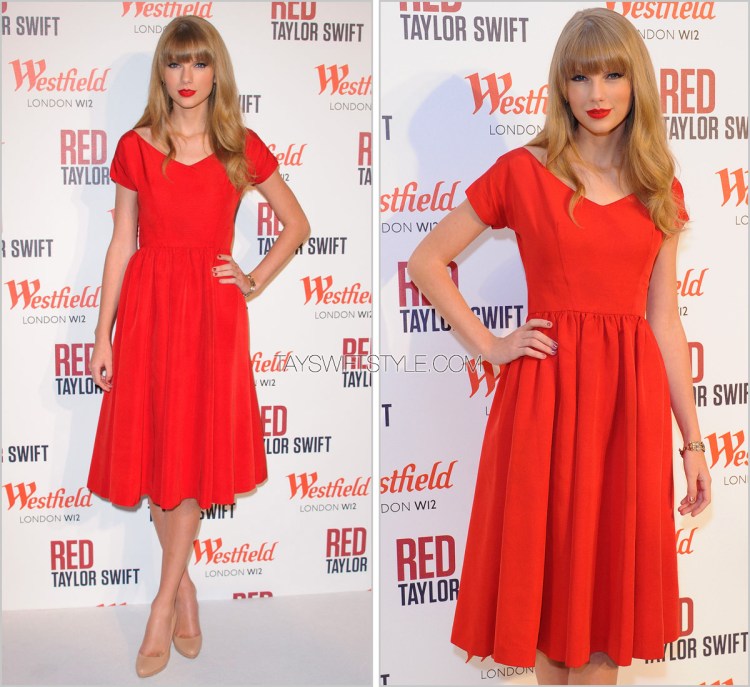 Taylor cut a classic silhouette in this midi vibrant red vintage dress (that happened to land on my 20th birthday).