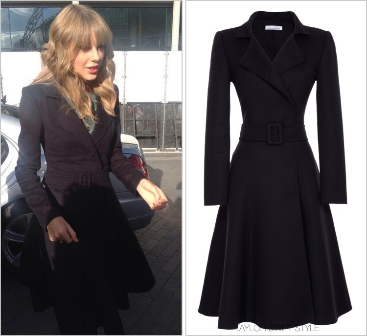 To keep in tune with the chill of London’s fall, Taylor covered up in this perfectly tailored OdlR coat from their Pre-Fall 2013 collection before hitting the red carpet where she wore the green Jenny Packham dress you can see a sliver of underneath her coat!
