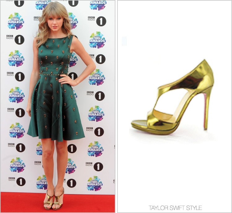 As if getting a hold on a pair of Louboutins isn’t hard enough, this particular pair proved especially difficult. It’s been worn by the likes of Cate Blanchett and Nieves Alvarez but never found its way into stores. Taylor revives them here to make a matchy statement with the golden embellishments on her dress.