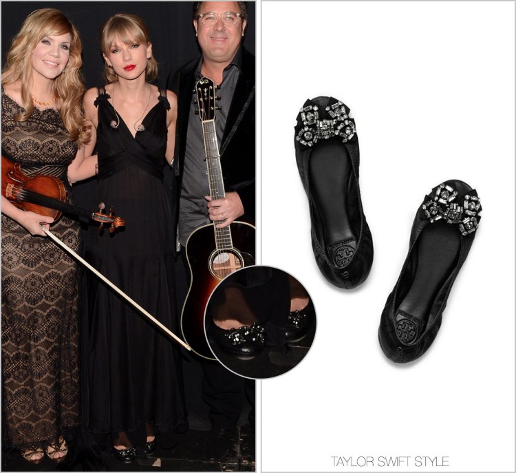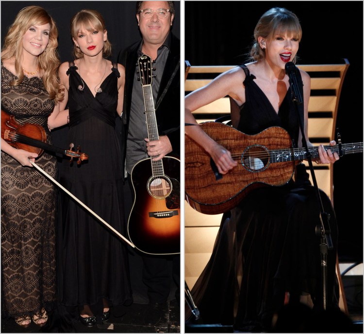 For her stripped back version of “Red” with Alison Krauss and Vince Gill, Taylor was given the opportunity to go through the D&G archives – finally landing on this beautifully draped grosgrain strapped black chiffon gown.