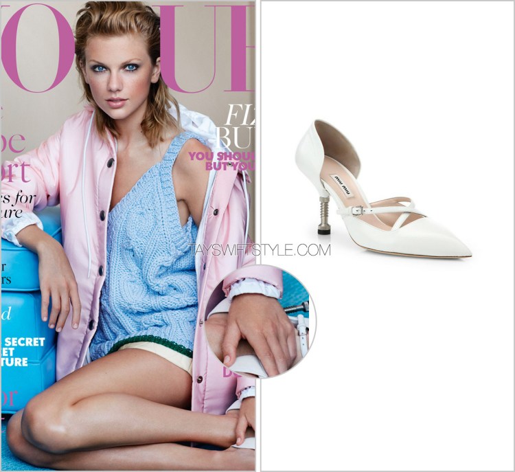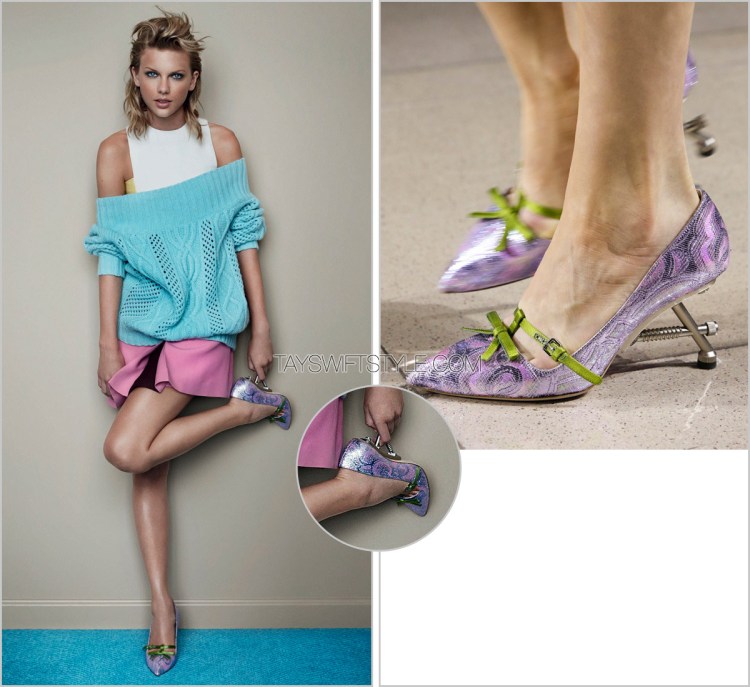 I love the super interesting screw heels and contrasting print with the delicate bow on these Miu Miu heels Taylor wore in her 80s-inspired spread with Vogue (U.K.)