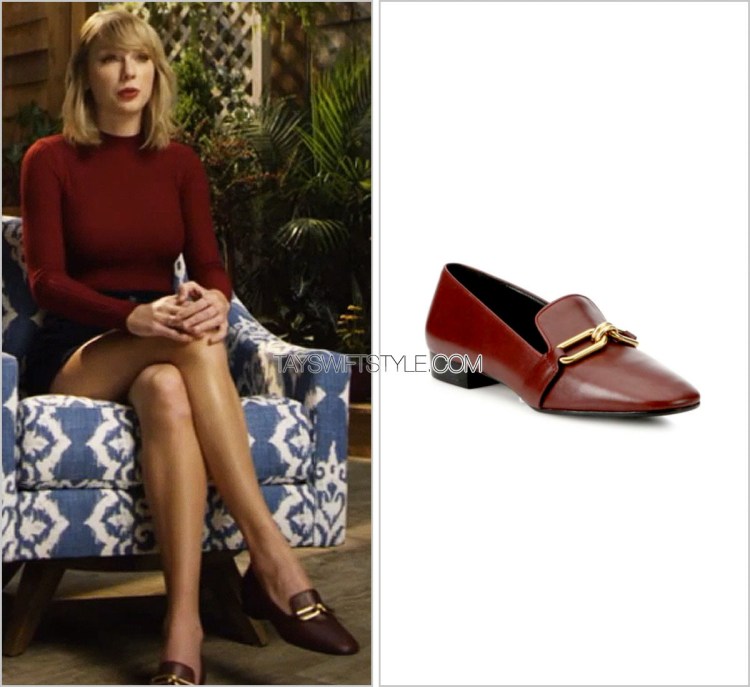 Obviously to bring out the tones of her lip and sweater, these loafers were a perfect casual touch to round out the palette of the outfit.