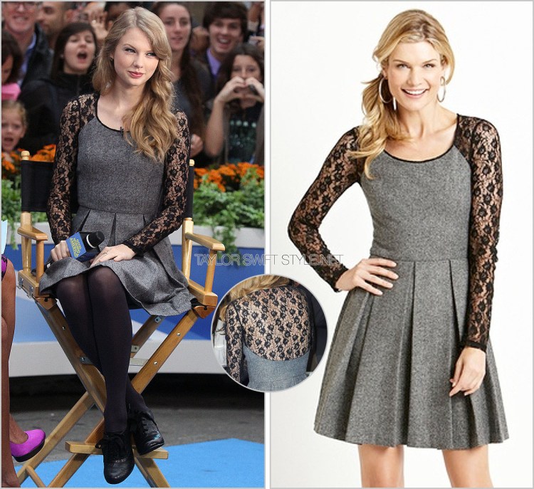 For her appearance on GMA Taylor wore this grey pleated dress featuring beautiful lace sleeves and a full lace back.