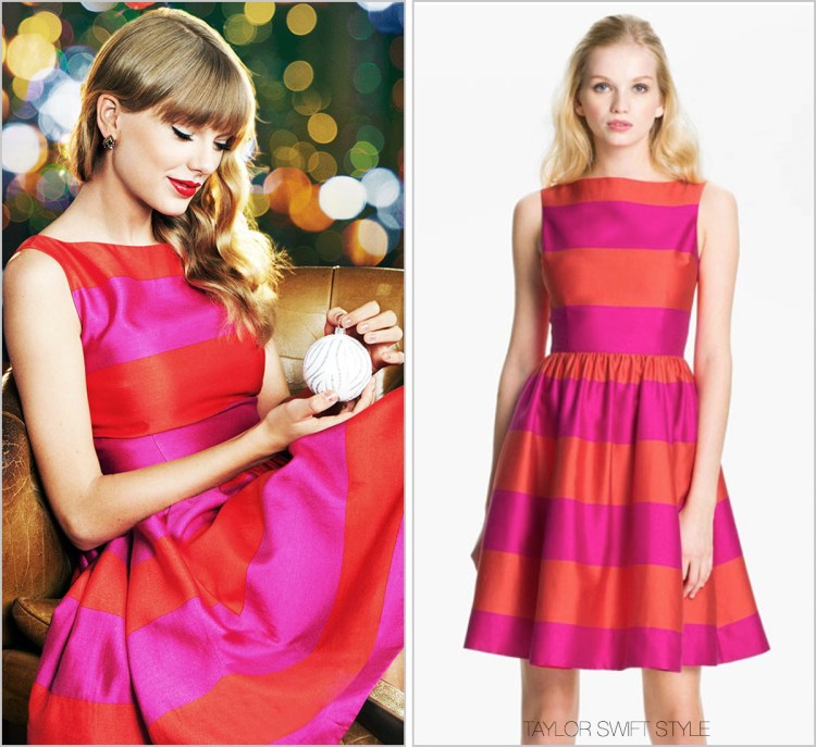 In addition to this fuchsia and orange colourway for her photoshoot, Taylor later wore this same dress in black and white for the KIIS FM Jingle Ball.