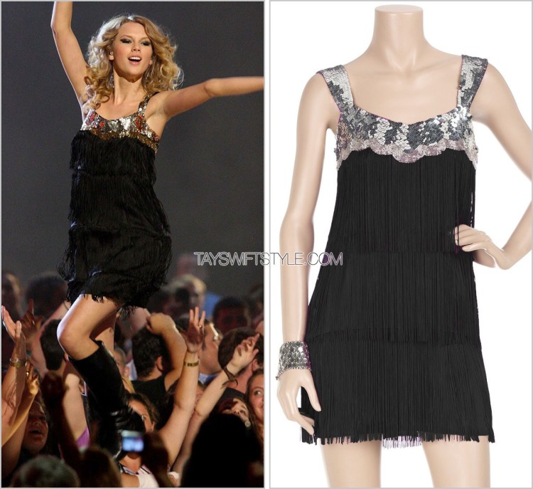 Taylor rocked the stage with Def Leppard, closing out the CMT Music Awards ceremony in 2009 wearing this fringed dress by Rachel Gilbert.
