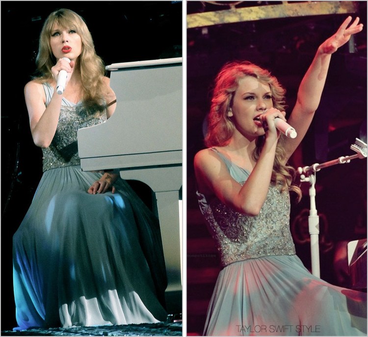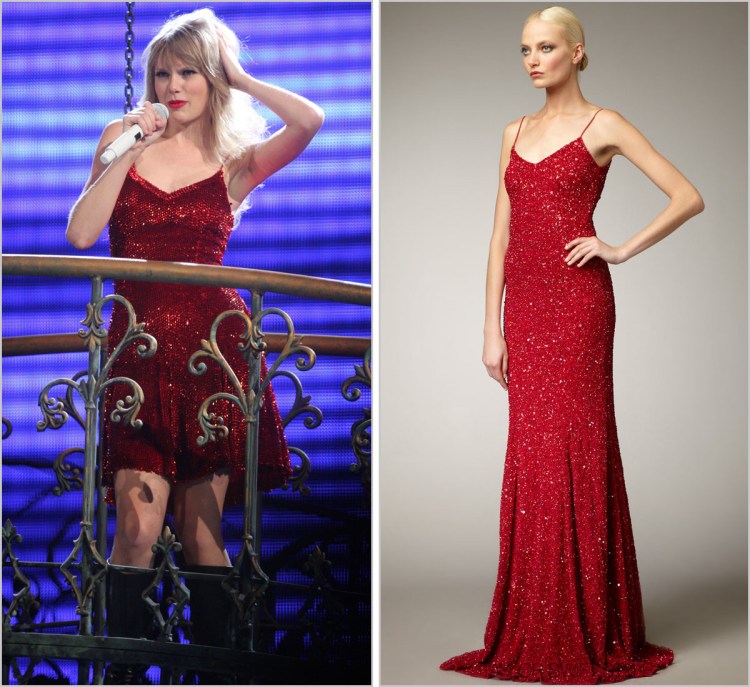 If you’re wondering why this Marchesa gown is custom-made, here’s a rundown. In the special 60 Minutes conducted on Taylor they did a behind-the-scenes look of her Speak Now Tour. In this video (@ 2:53) you can see Taylor running under the stage in this dress to get onto the platform that rises up with her piano to play “Back To December.” Unlike during her performance where she strictly keeps her entire right side exposed to the audience and doesn’t get up from her bench or move, this shot of Taylor running is taken from her left side. You can see the way Taylor’s Marchesa gown is loosely buttoned together and underneath her gown is the bright red sequin dress she wears for “Better Than Revenge.”