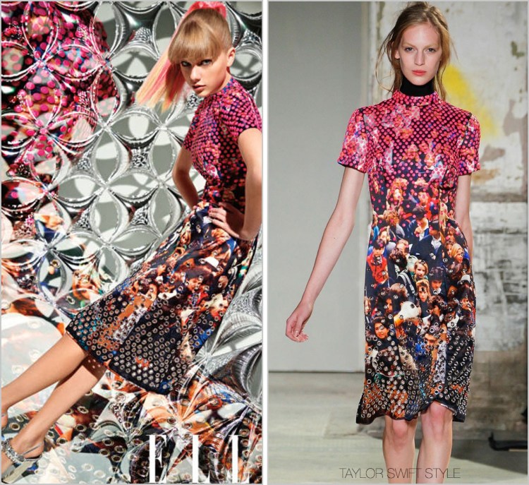 Looking like a grecian goddess, this gown by J. Mendel was saved from being just another ivory chiffon confection in Taylor’s repertoire by that thigh-high slit and micro-bugle metallic straps that were custom-fitted on the plunging neckline for Tay’s version of the runway dress.