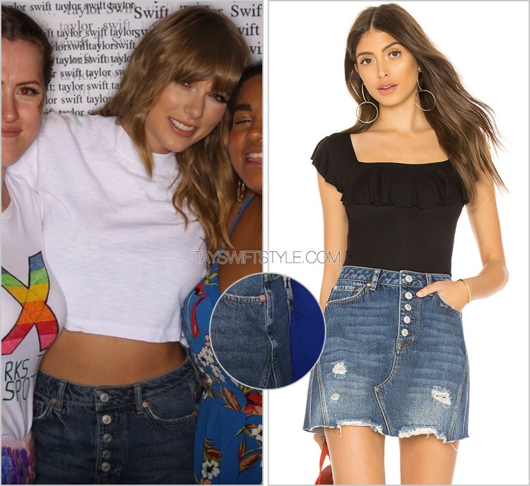 What I at first envisioned as a pair of high waisted shorts actually turns out to be a frayed denim skirt by the long-beloved Free People. Taylor paired it with a sheer mock neck crop top (bit of a nod to the 1989 Era).