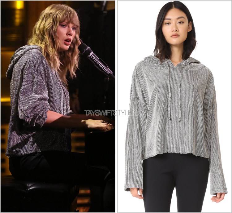 I dig this hoodie because it embodies all the elements that reputation style has been serving so far (hoodie, oversized, neutral tones) but has a bit of shimmer to it that looks beautiful and glows under the stage lights.