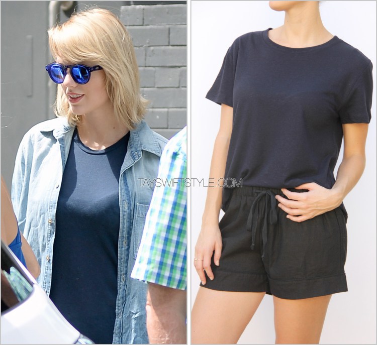 Taylor’s appropriately-named boxy-fit black tee she wore while returning to North America with Tom is by L.A. brand S&T.