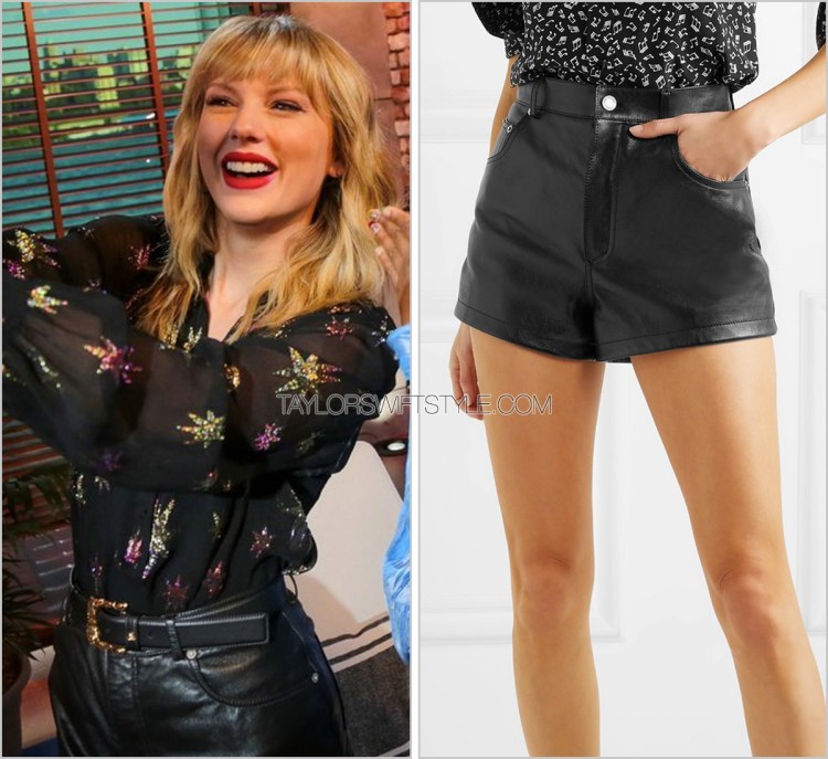 While I didn’t approve of the last time Taylor wore a bold pair of ankle boots by Saint Laurent, this fares much better paired with this outfit. Namely because the bright fuchsia tones speak back to the embellishments on her blouse.