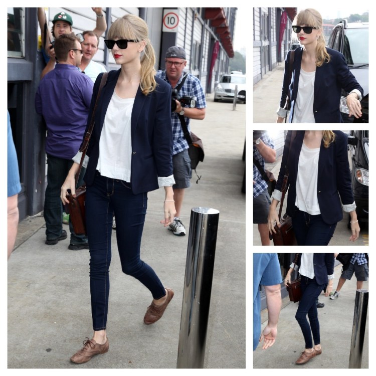 Sarah: Arguably her most put-together candid outfit of the calendar year. Everything about this outfit represents staple pieces that should be in every girl’s closet. A solid pair of jeans, leather satchel, navy blazer, scoop-neck white tee and some brown leather oxfords. Easy, casual and completely on-point fashion wise.