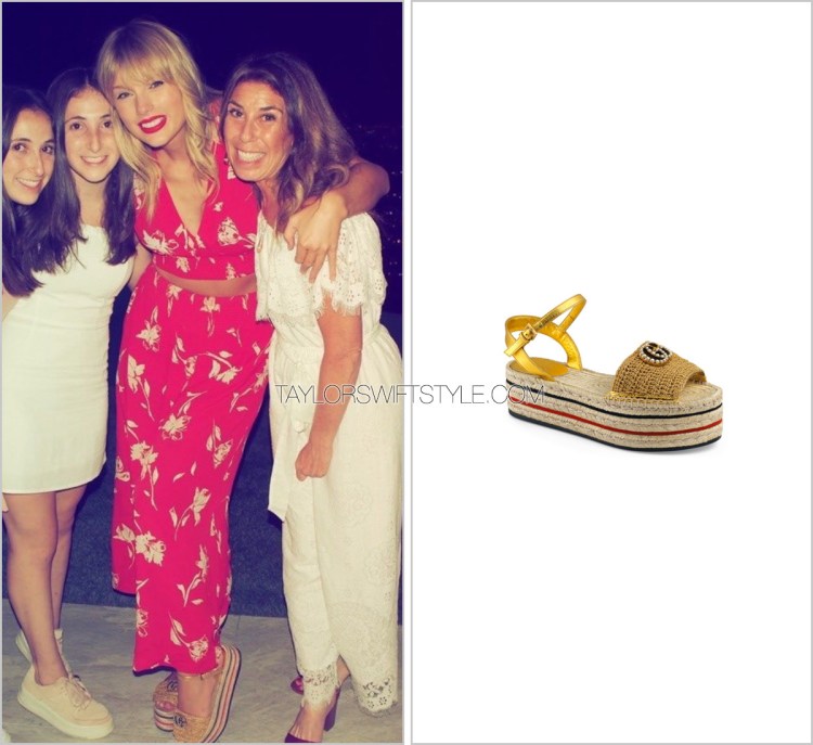 Taylor finished her outfit with a stacked pair of golden espadrilles from Gucci. The red stripe in the platform speaks back to the red of the ensemble but my preference would have been a non-metallic nude option.